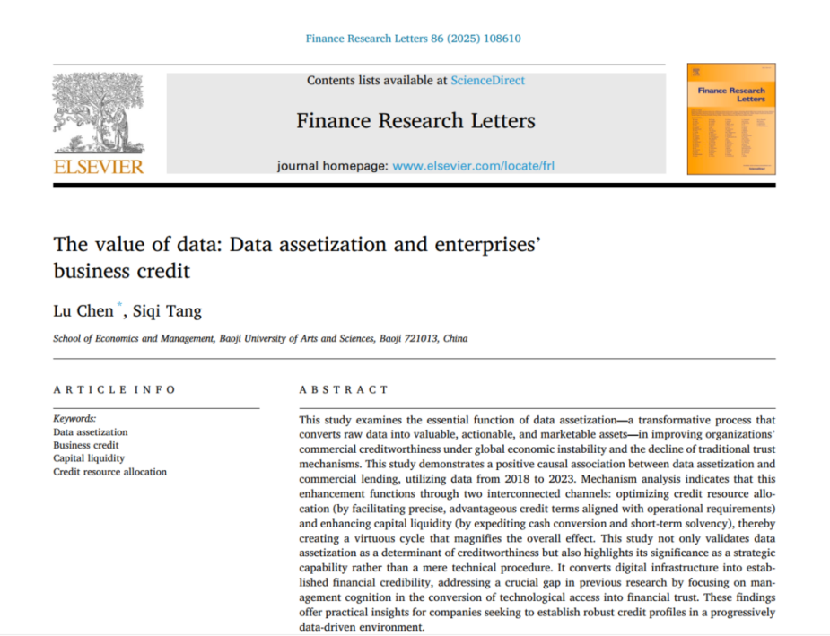 近日,开元经济管理学院谌璐博士与2024级会计硕士专业学位研究生(MPAcc)汤思琪合作撰写的研究论文“The value of data:Data assetization and enterprises' business credit”发表在国际知名期刊Finance Research Letters上。该期刊被SSCI收录,属于JCR一区、中科院二区期刊,在JCR学科类别的Business/Finance中排名第12(12/242)位,最新影响因子6.9。