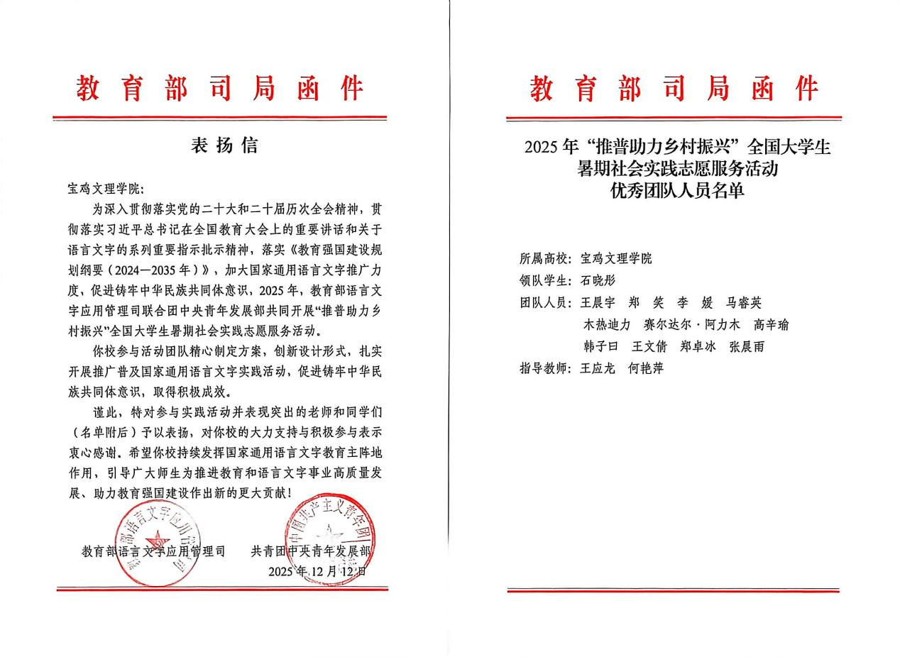 近日,由教育部语言文字应用管理司、共青团中央青年发展部联合开展的2025年“推普助力乡村振兴”全国大学生暑期社会实践志愿服务活动评选结果揭晓,开元推普团队获“优秀团队”荣誉称号并受到来信表扬。